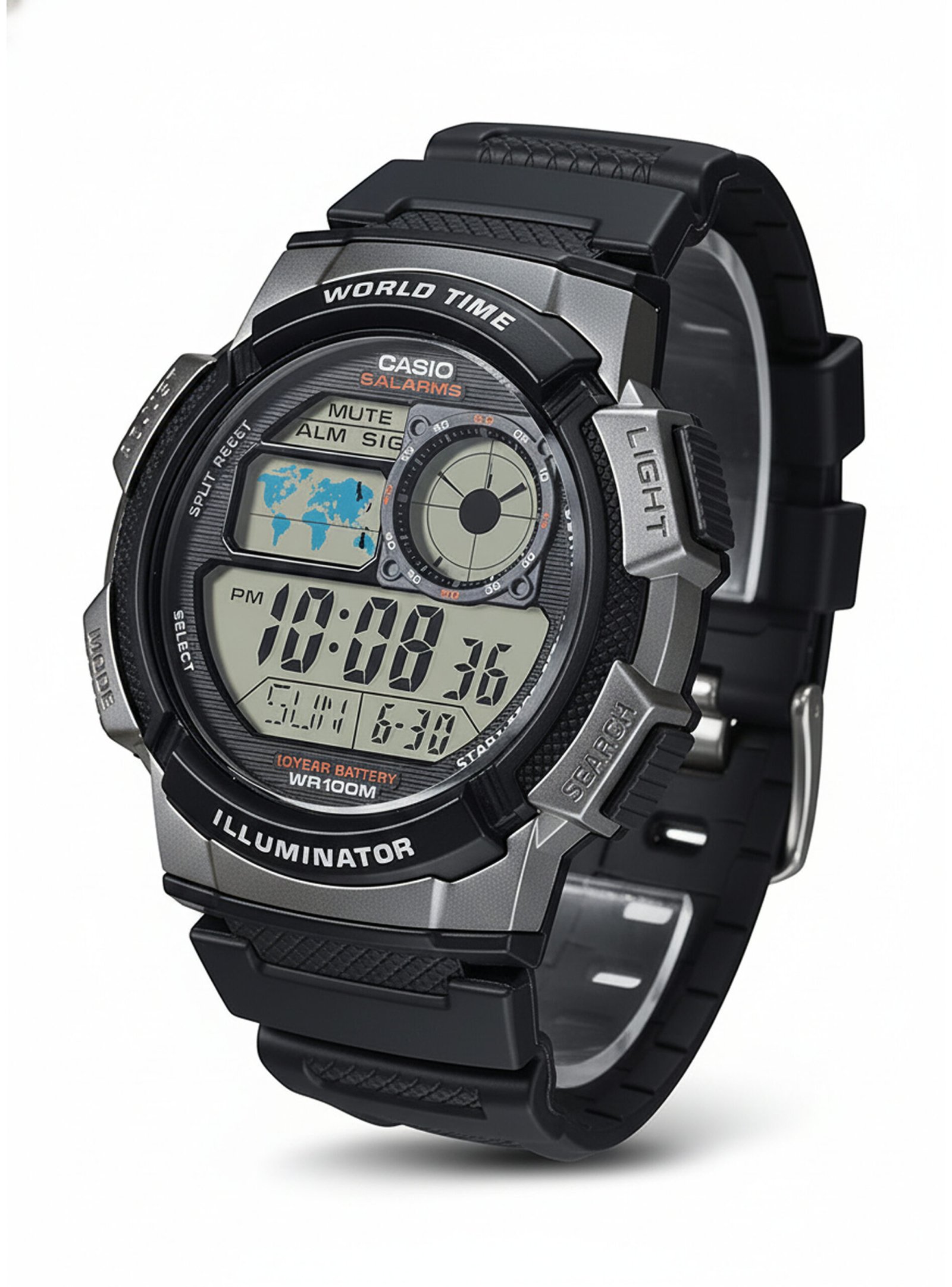 El Casio AE-1000W-1BV es un reloj digital multifuncional diseñado para aventureros y viajeros. Su mapa mundial digital, su resistencia al agua y su diseño robusto lo hacen ideal para quienes buscan precisión y durabilidad. Cuenta con hora mundial, cronómetro, temporizador y alarmas, todo controlado con facilidad gracias a su interfaz clara y su pantalla de alta legibilidad.
