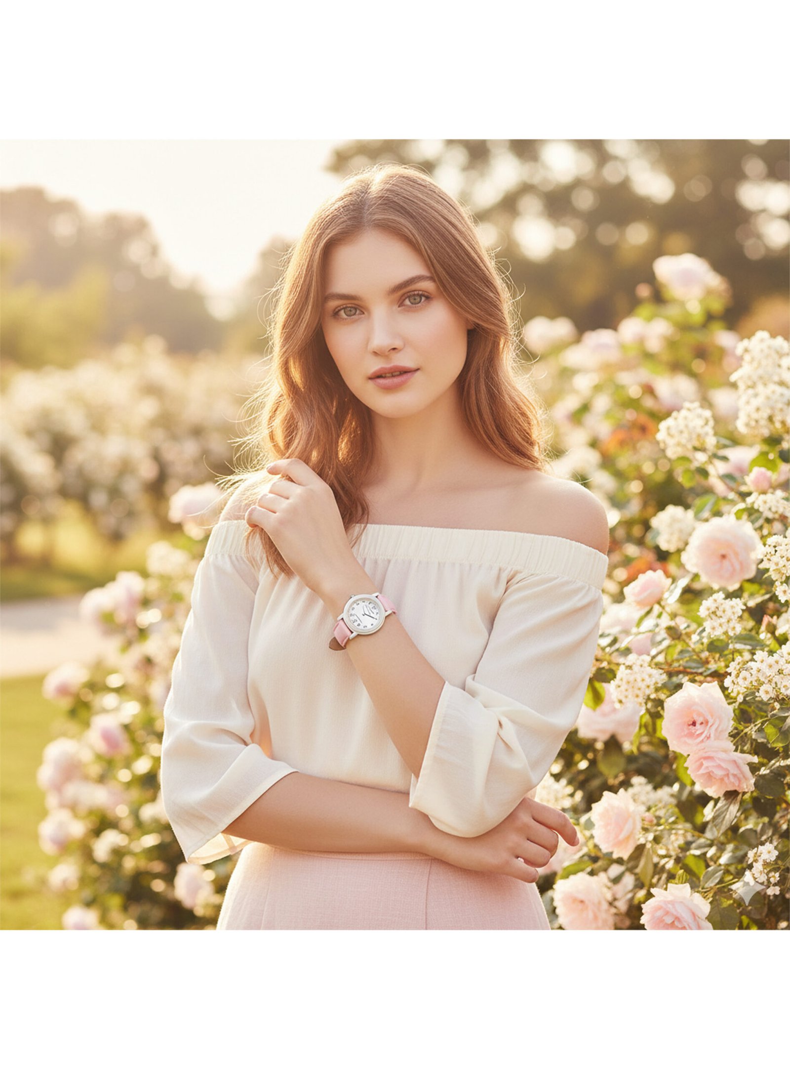 Con una esfera en color blanco con correa en tono rosa pastel, es perfecto para complementar looks cotidianos y ligeros.